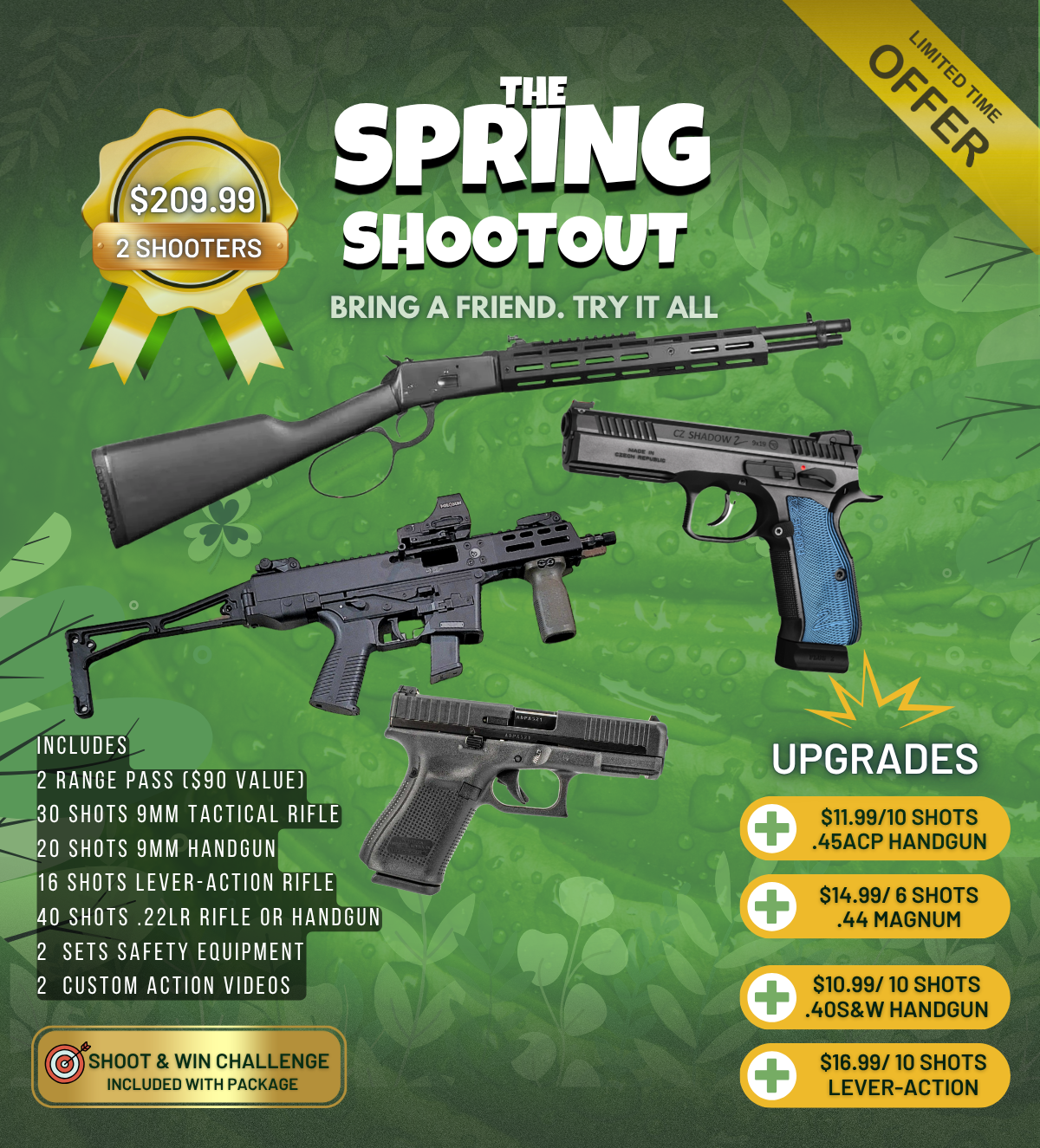 The Spring Shootout is a custom-tailored 4 gun experience for two, designed to give you the perfect mix of variety, excitement, and value at the range. You’ll get hands-on time with handgun, tactical rifle, lever action, and .22LR, making it an ideal option for date nights, friends, or first-time shooters. Every package also includes our Shoot & Win Challenge, where you can hit a special target for a chance to win a prize. It’s a fun, well-rounded experience that keeps things simple, engaging, and memorable from start to finish.