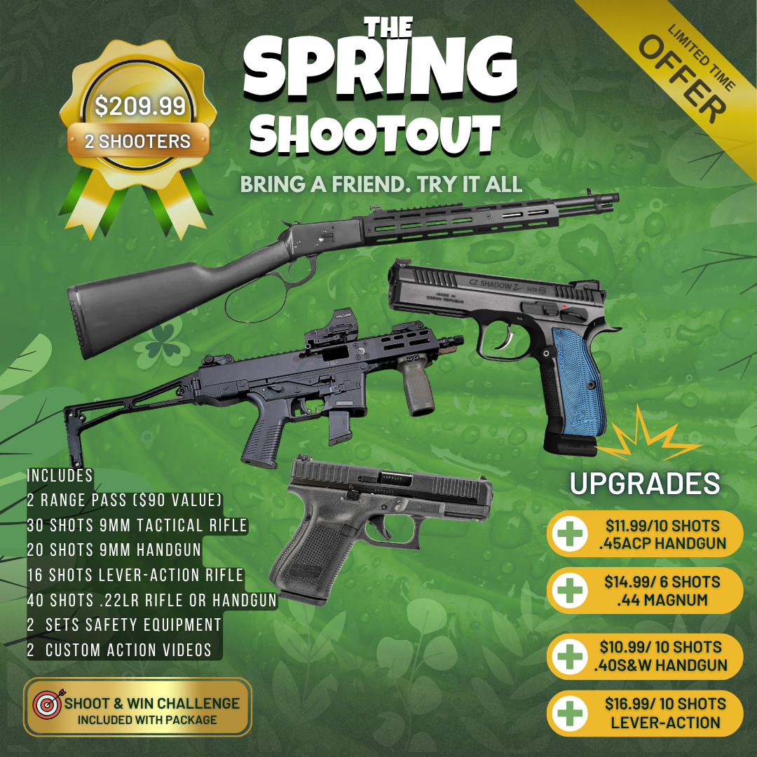 The Spring Shootout is a custom-tailored 4 gun experience for two, designed to give you the perfect mix of variety, excitement, and value at the range. You’ll get hands-on time with handgun, tactical rifle, lever action, and .22LR, making it an ideal option for date nights, friends, or first-time shooters. Every package also includes our Shoot & Win Challenge, where you can hit a special target for a chance to win a prize. It’s a fun, well-rounded experience that keeps things simple, engaging, and memorable from start to finish.