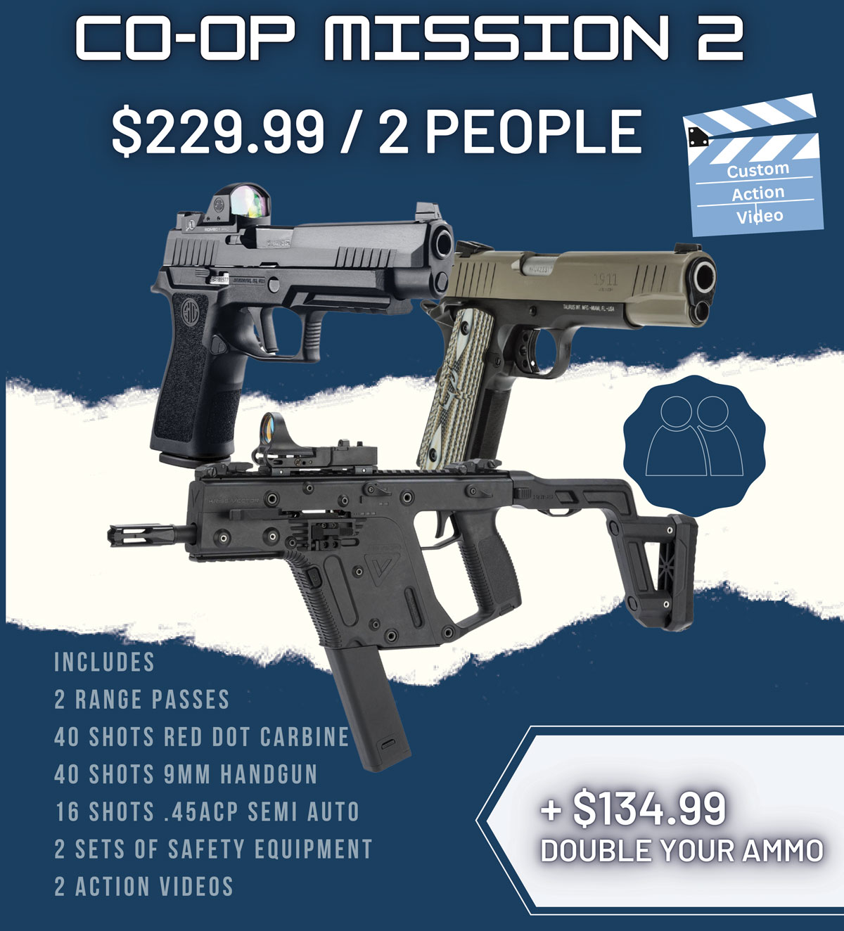 A dynamic shooting experience for 2 people, featuring a mix of firearms, safety equipment, and custom action videos. Perfect for pairs or duos!
