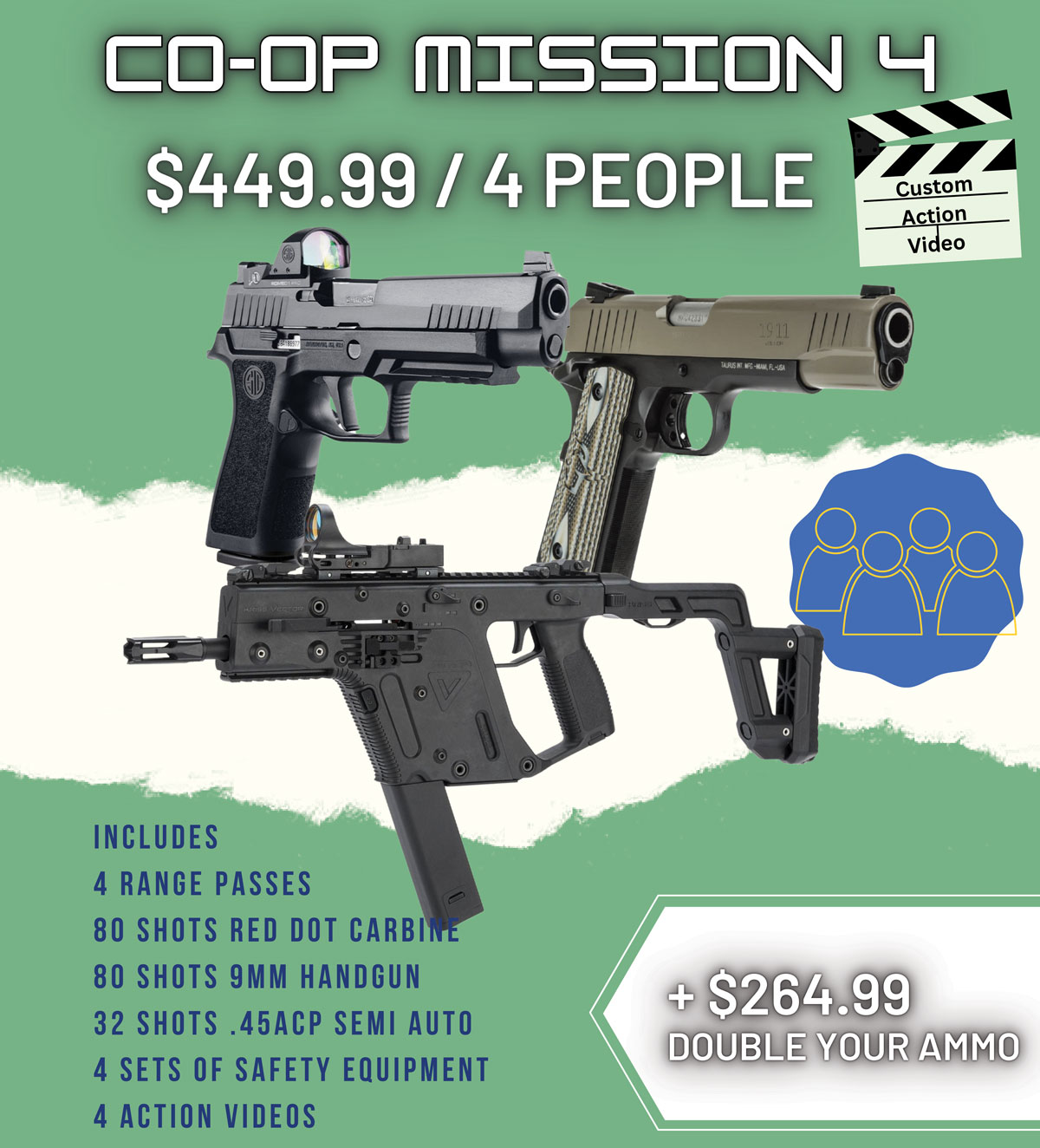 Experience our premium tactical package designed for groups of 4. This mission includes a variety of firearms and extensive range time for the ultimate team shooting experience.